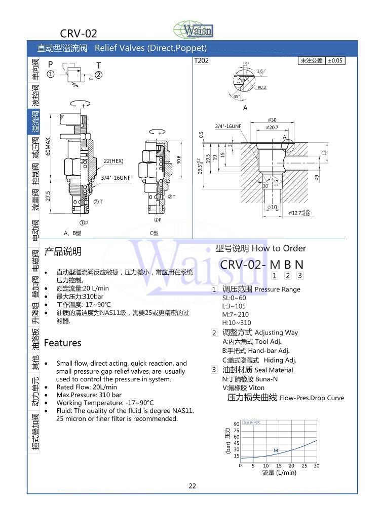 waisn台湾崴盛直动型溢流阀_CRV-02-MAN 产品说明: ·直动型溢流阀反应敏捷,压力差小,常应用在系统压力控制 ·额定流量:20L/min ·最大压力:310bar ·工作温度:-17~90℃ ·油质清洁度为NAS11级,需要25或更精密的过滤器 常规型号如下: CRV-02-LAN,CRV-02-MAN,CRV-04-MAN,CRV-04-HAN CRV-02R-LAN,CRV-04R-LAN,CRV-02R-MAN CRV-04R-MAN,CRV-02R-HAN,CRV-04R-HAN